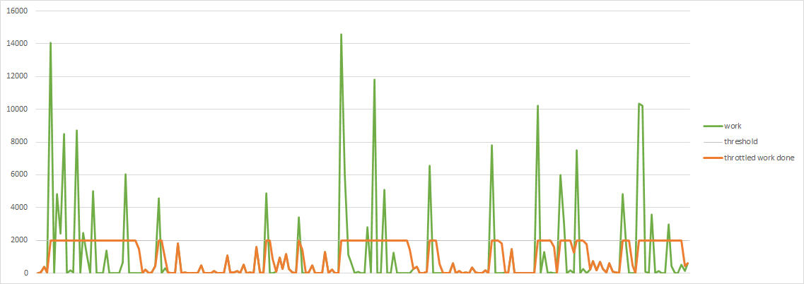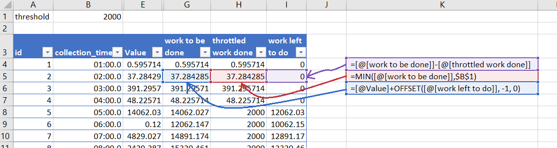 Using Excel, I added three new calculated columns, work_to_be_done, throttled_work_done, and work_left_to_do. If there was any work left to do, it fed into the work to be done of the next row like this: