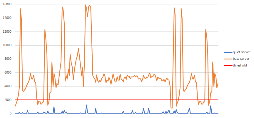 The light traffic server (blue line) would never be notice if we applied a maximum threshold of 2000 IOPS. So that mirror is safe to throttle and point to the primary. Meanwhile the traffic from the heavy traffic server (orange line) could never do the same amount of work if we throttled it.
